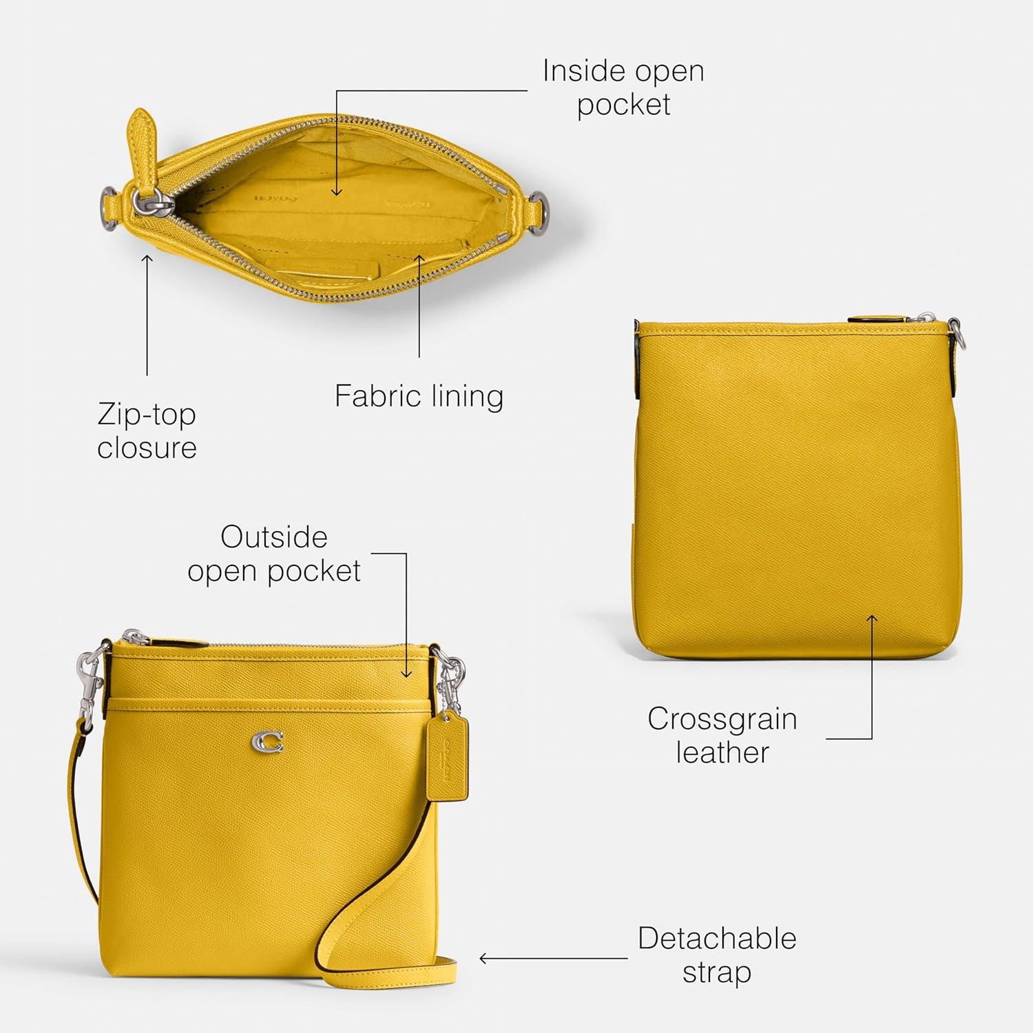 It’s All in the Details: Inside open pocket, Zip-top closure, fabric lining, Outside open pocket. Detachable strap with 23″ drop. 7 3/4″ (L) x 8 3/4″ (H) x 1″ (W)